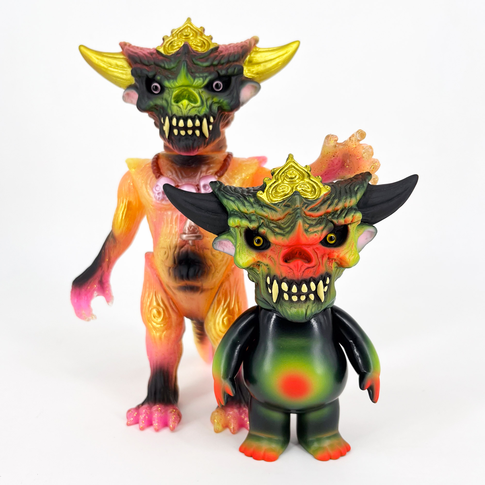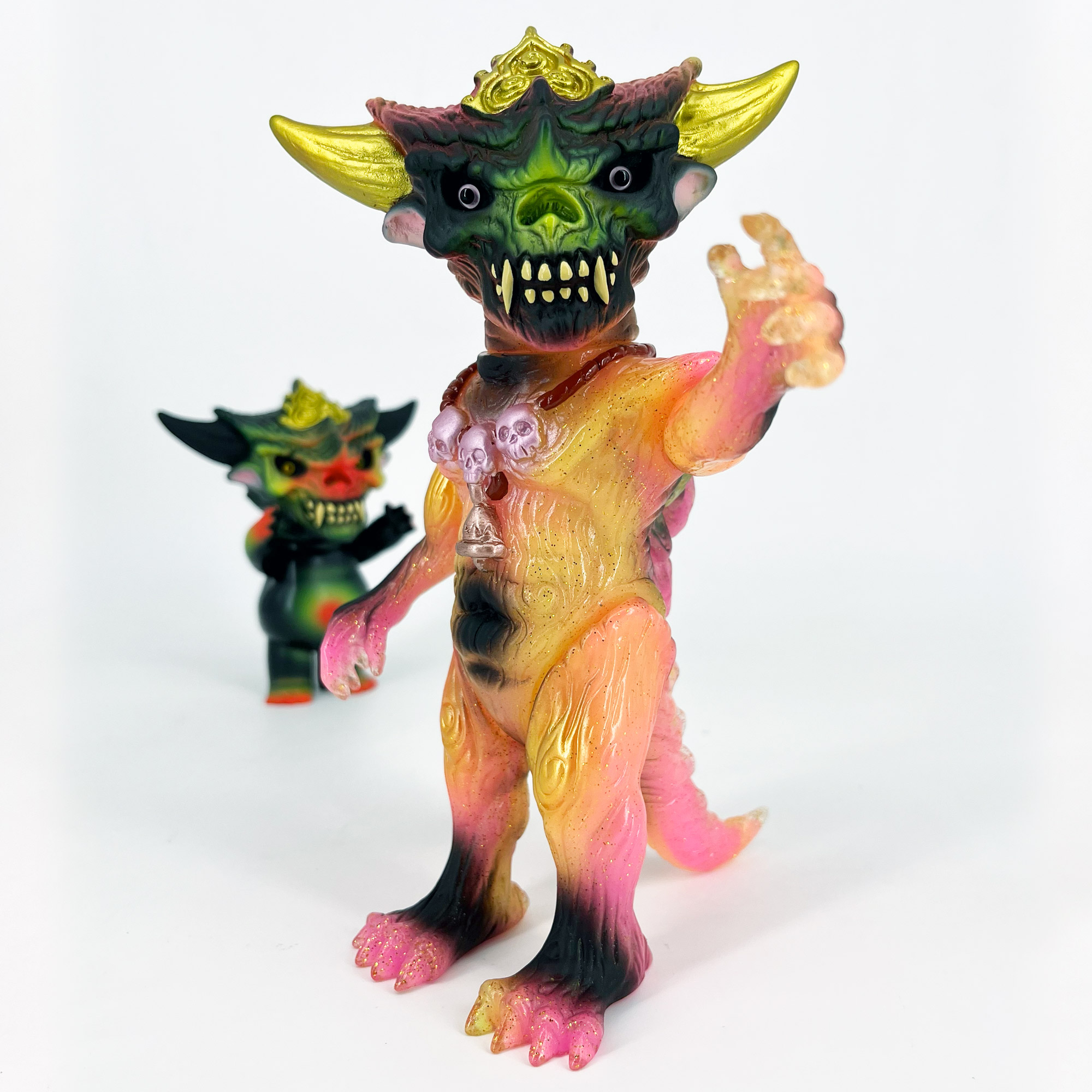 Years ago DHP did an adult and cub set for Dcon. They are back again in a whole new colorway. The adult features double pour vinyl with the outer layer being clear with gold glitter and the inner being yellow and pink GID. Flat black, pink, brown, yellow, tan, copper, metallic pink and gold paints bring this beast to life. The cub has been cast in black vinyl with yellow, fluorescent red, flat black, pink, tan and gold paints. To top it all off the adult has pink and cub has yellow glass eyes. A stunning set to say the least. $150 for the pair...made in Japan...painted in the USA. Not intended for children under 14 years old.