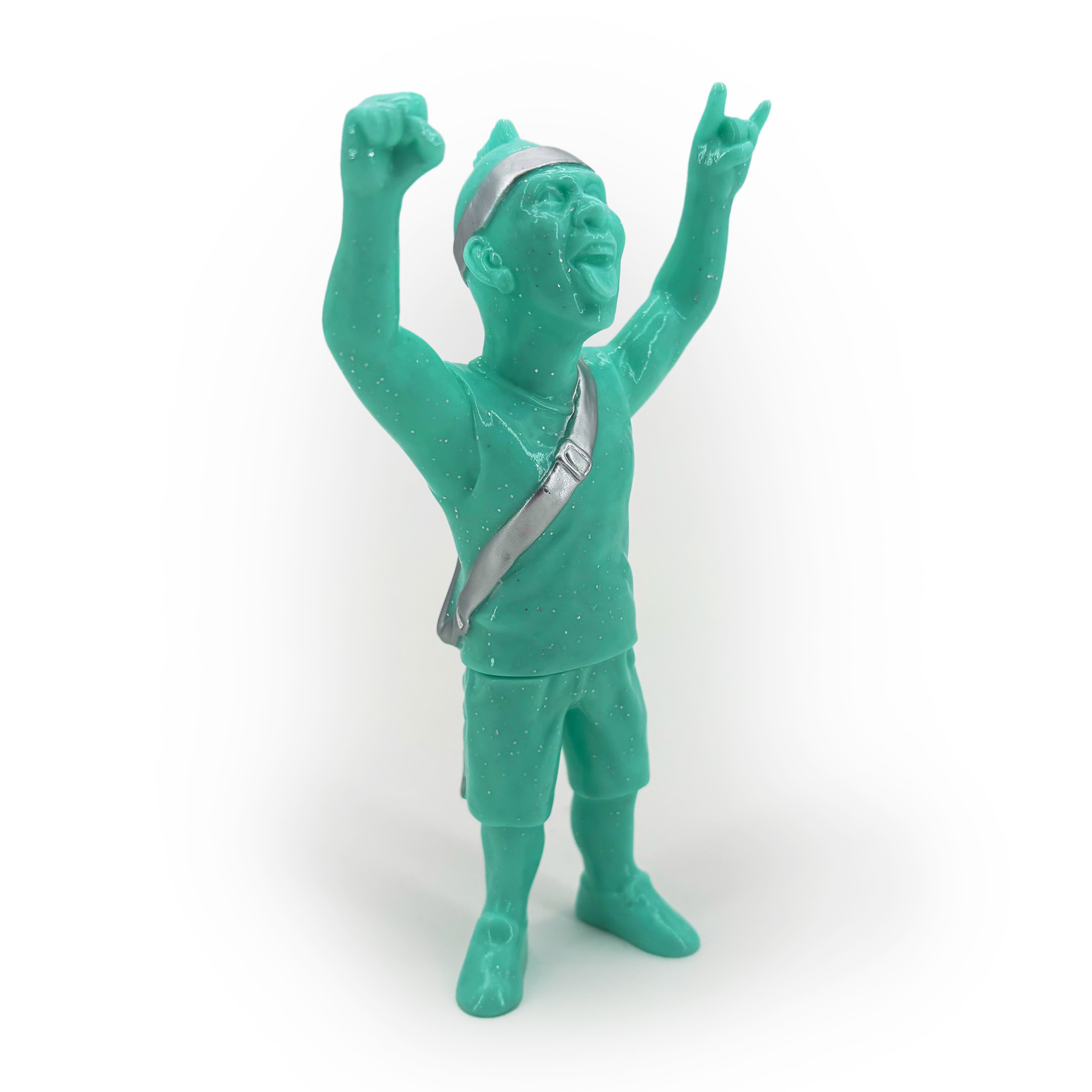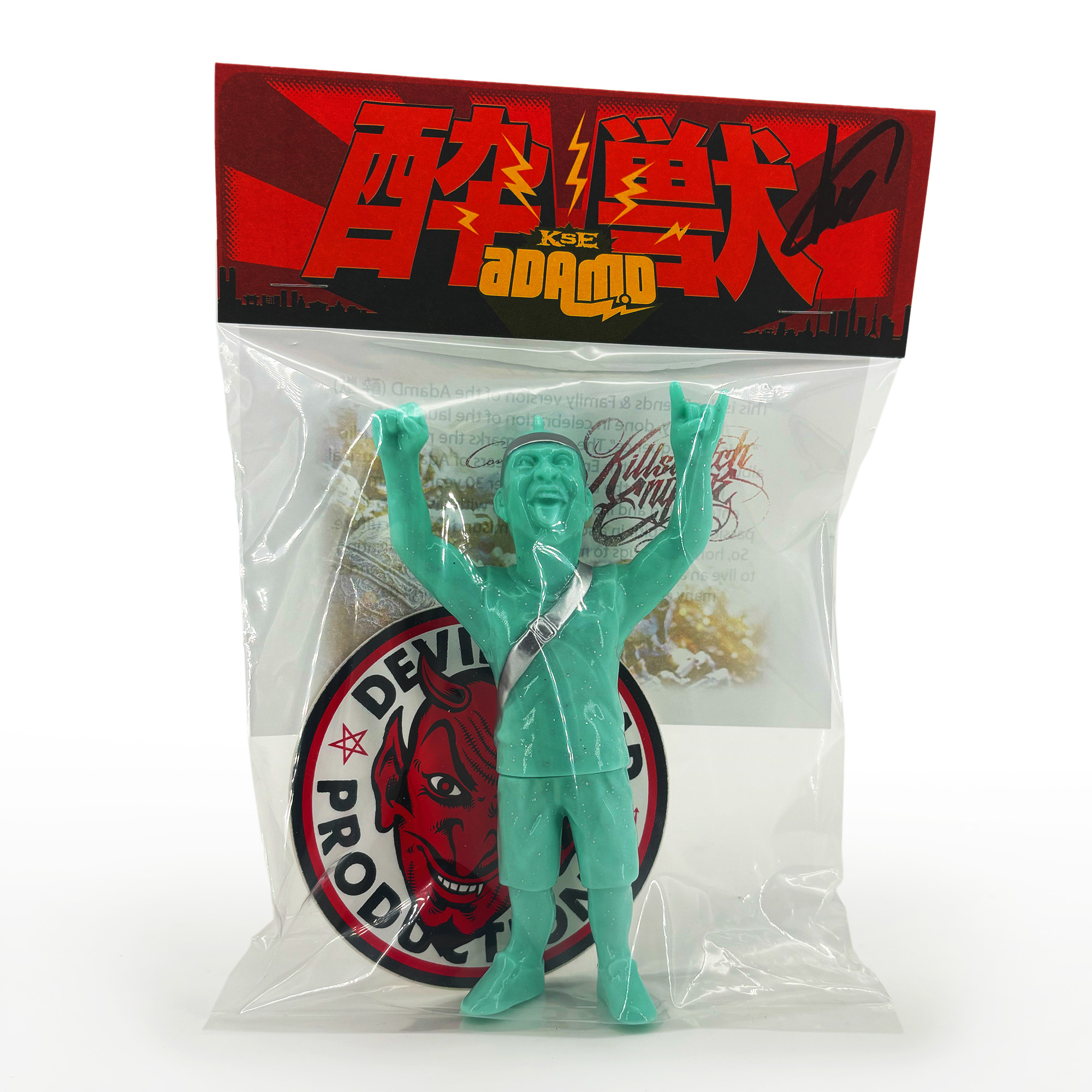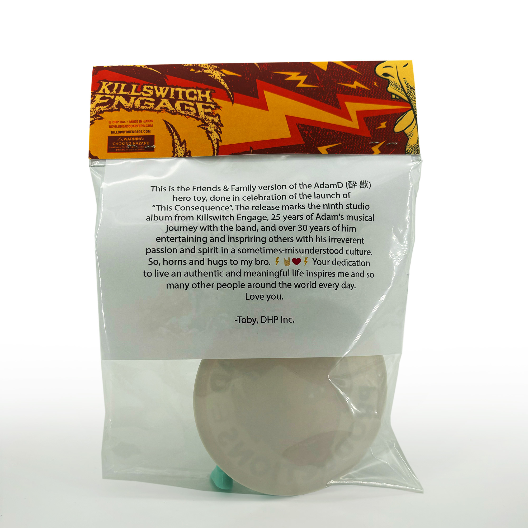 Earlier this year the standard unpainted version of this toy was released through the Killswitch Engage US web shop as an exclusive. A few were for sale on tour as well but these extra-special painted versions were premiere gifts to friends and family of Adam. Cast in "Tiffany blue" colored vinyl with silver glitter embedded throughout and silver painted details, these feature signed header cards, stickers and a write up celebrating Adam and the release of This Consequence. Never available to the public until now and limited to only 4 pieces for sale. For the ultimate KsE collector. $75 each...made in Japan...painted in the USA. Not intended for children under 14 years old.